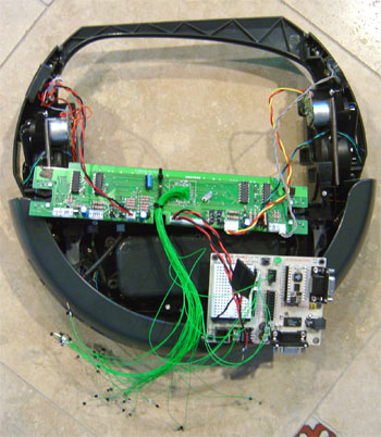 | Inside view of the roomba. The micro has been desoldered and every pin has a flylead for 'experimentation'. | ||